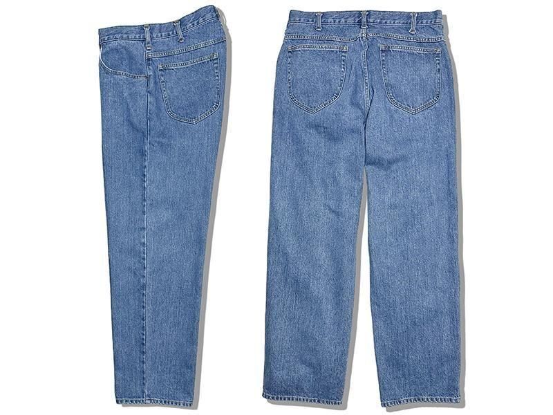 ベーシックな5ポケットデニムを基にヒップから腿周りをリラックスシルエットにし、裾にかけてのテーパードは緩めで、裾幅もスニーカーを引きずらない丁度良い太さです。デニム生地は13ozの100%ピュア―インディゴでアメリカ人が良く履いてるストアデニムの雰囲気を出せるようにストーンウオッシュもぼんやり系で完璧なデニムです。5のポケット、ジップフライ仕様。 ■身長182cm/体重76kg/36インチ着用です