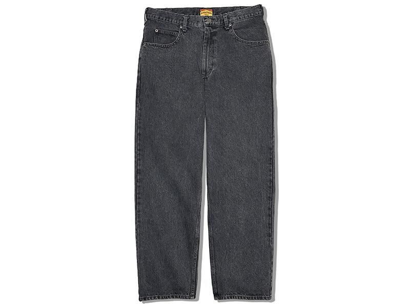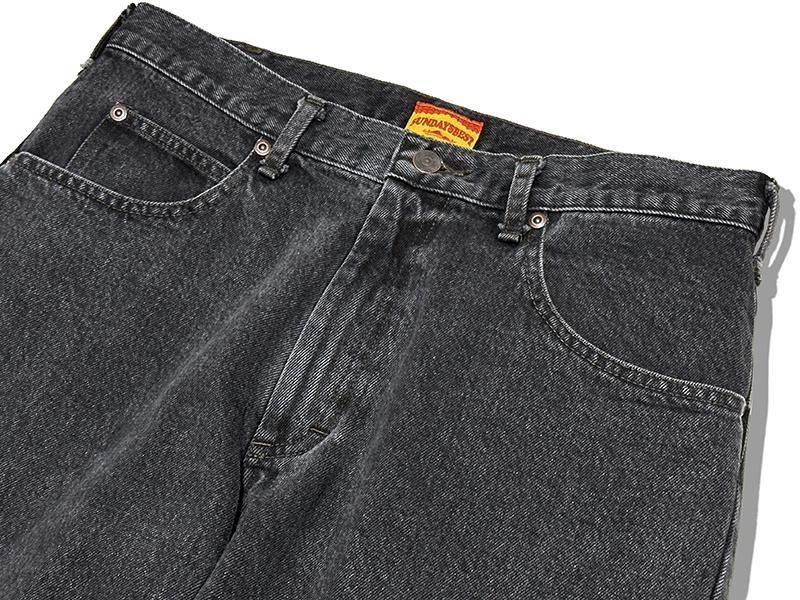 SUNDAYS BESTのオリジナルウォッシュデニムにブラックデニムが登場です。ベーシックな5ポケットデニムを基にヒップから腿周りをリラックスシルエットにし、裾にかけてのテーパードは緩めで、裾幅もスニーカーを引きずらない丁度良い太さです。デニム生地は13ozのブラックデニムでアメリカ人が良く履いてるストアデニムの雰囲気を出せるようにウオッシュもぼんやり系なエルパソブラックで完璧なデニムです。5個のポケット、ジップフライ仕様。 ■身長182cm/体重76kg/36インチ着用です