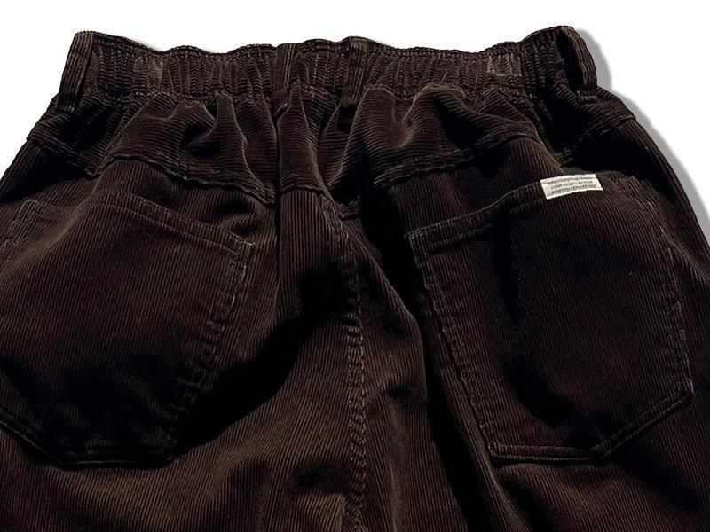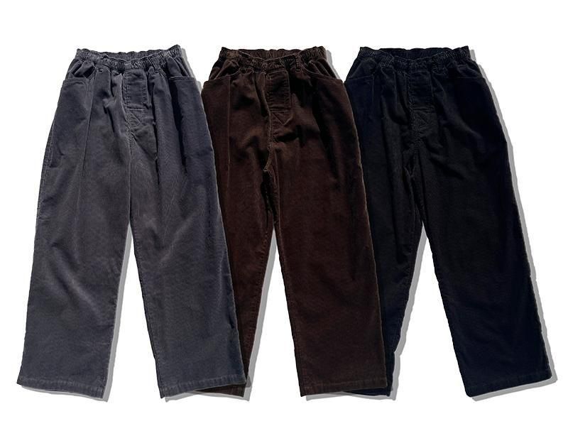細畝のコーデュロイを使用したスラックス。シルエットは25SSでも好評だったストレートタイプから裾幅を若干狭く微調整したテーパード感の少ないシルエット。ウエストはゴム仕様ながらベルトループも付くのでタックインでの着こなしにも対応着用モデル身長180cm