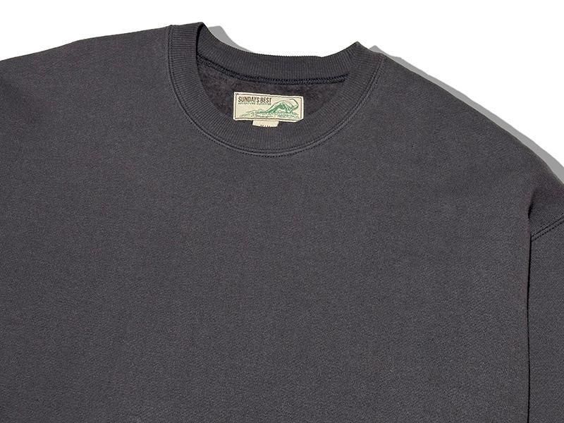 SUNDAYS BESTのオリジナル・クルーネックスウェットのニューカラーです。このクルーネックは生地から生産、染色し、新品では中々無い色あせたカラーリングを作りました。こちらは大好きな退色したブラックのEL PASO BLACK!完璧な色あせ感です。形は大好きな着丈短め、身幅広め、アームホールやや広めの最高シルエットで、100%コットンのスウェット生地です。裏生地はパイルを手作業で裏起毛加工し、製品洗いでカラッと仕上げてます。国内工場で一つ一つ丁寧に仕上げてもらったコットン100%なのに軽くて暖かい最高のクルーネックです。