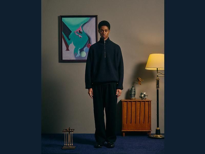 ウールアクリル素材でミドルゲージのハーフジップニット。衿は折り返しての着用も可能。カジュアルになり過ぎないスマートなシルエット。ウール50%/アクリル50%